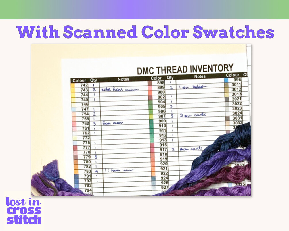 Cross Stitch DMC Floss Color Chart Inventory (No.3) | 3-Page Printable Thread Organizer with Notes | A4 & US Letter PDF